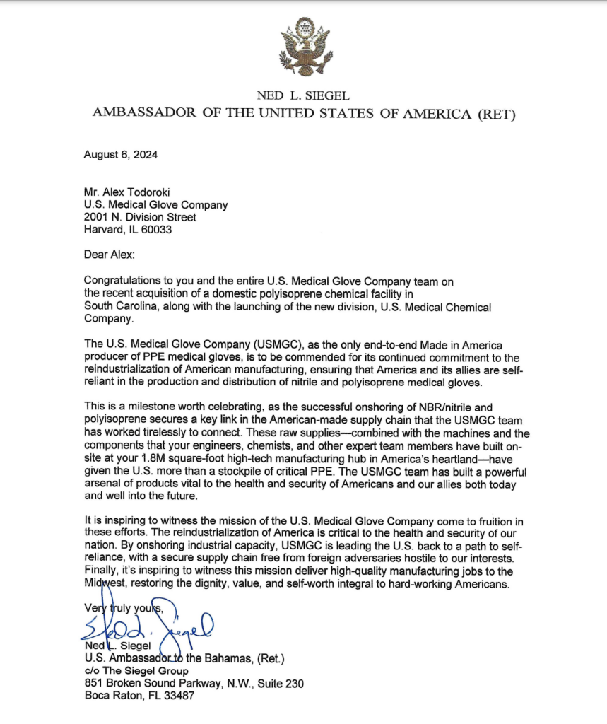 Thank you to Ned L. Siegel, U.S. Ambassador to the Bahamas, for your affirming words and your constant support as a committed partner of U.S. Medical Glove Company. We look forward to continuing to do our part to strengthening the health and security of our nation.